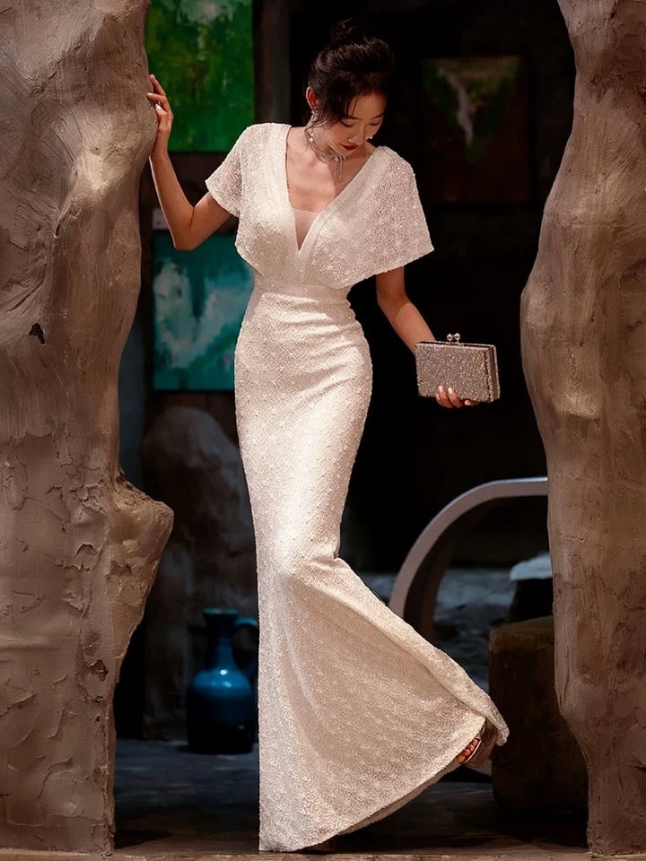 甘さと優雅さを兼ね備えたマーメイドドレス。美しいシルエットが魅力で、身体を包み込むようにフィットします。